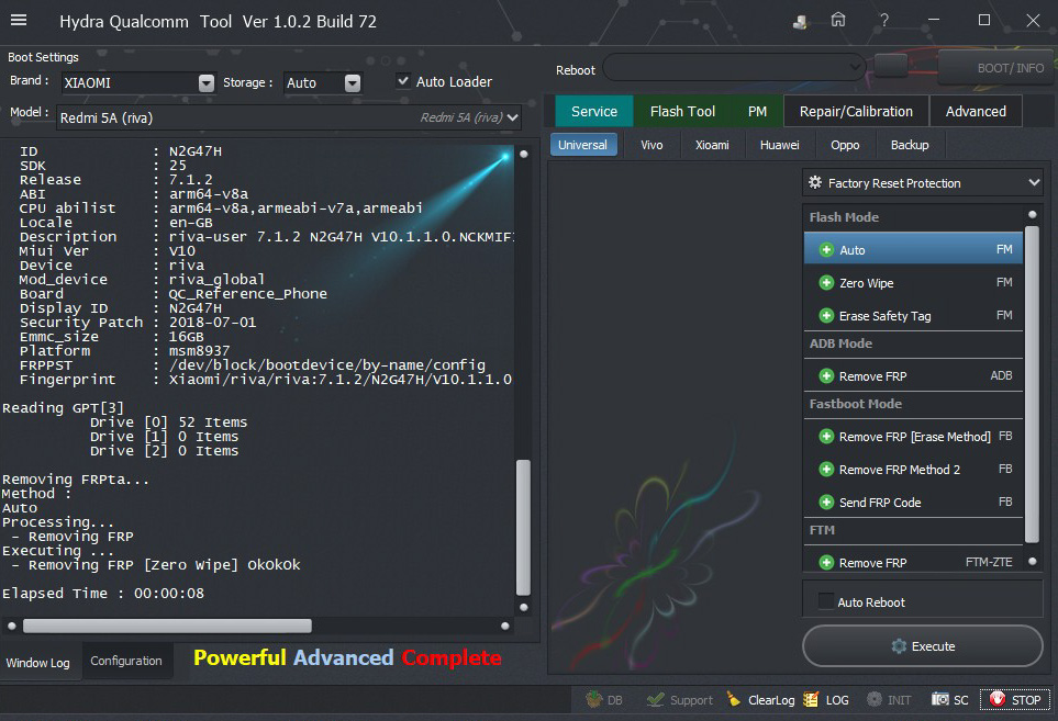 Xiaomi Redmi 5A (riva) Zero Wipe FRP successfully removed by Hydra Tool