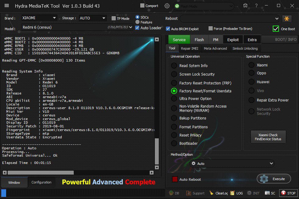 Xiaomi Redmi 6 (Cereus) Factory reset or format user data remove dy Hydra Tool
