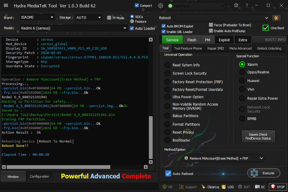 Xiaomi Redmi 6 (Cereus) Mi Account and FRP successfully removed by Hydra Tool