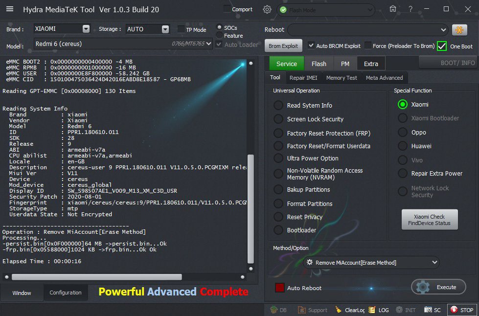 Xiaomi Redmi 6 (Cereus) Mi Account Removed using Erased Method by Hydra Tool