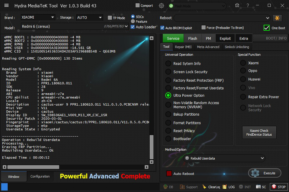 Xiaomi Redmi 6 (cereus) rebuilding user data successfully done by Hydra Tool