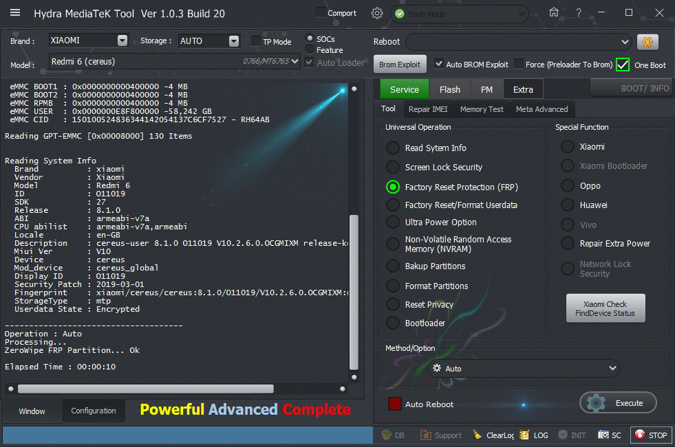 Xiaomi Redmi 6 Cereus Zerowipe FRP partition successfully done by Hydra Tool