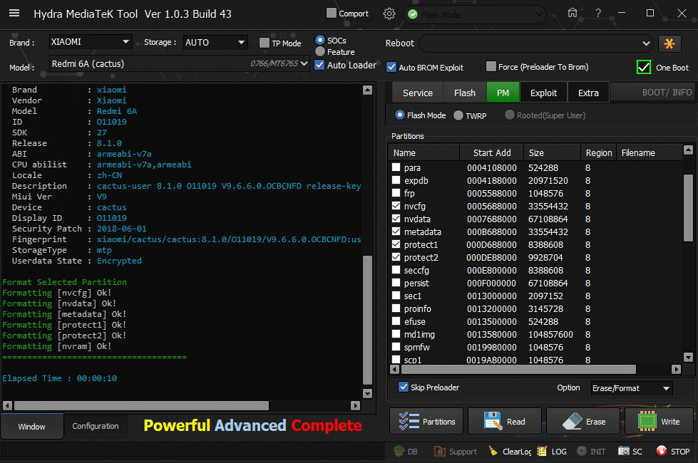 Xiaomi Redmi 6A (Cactus) formatted selected partition successfully done by Hydra Tool