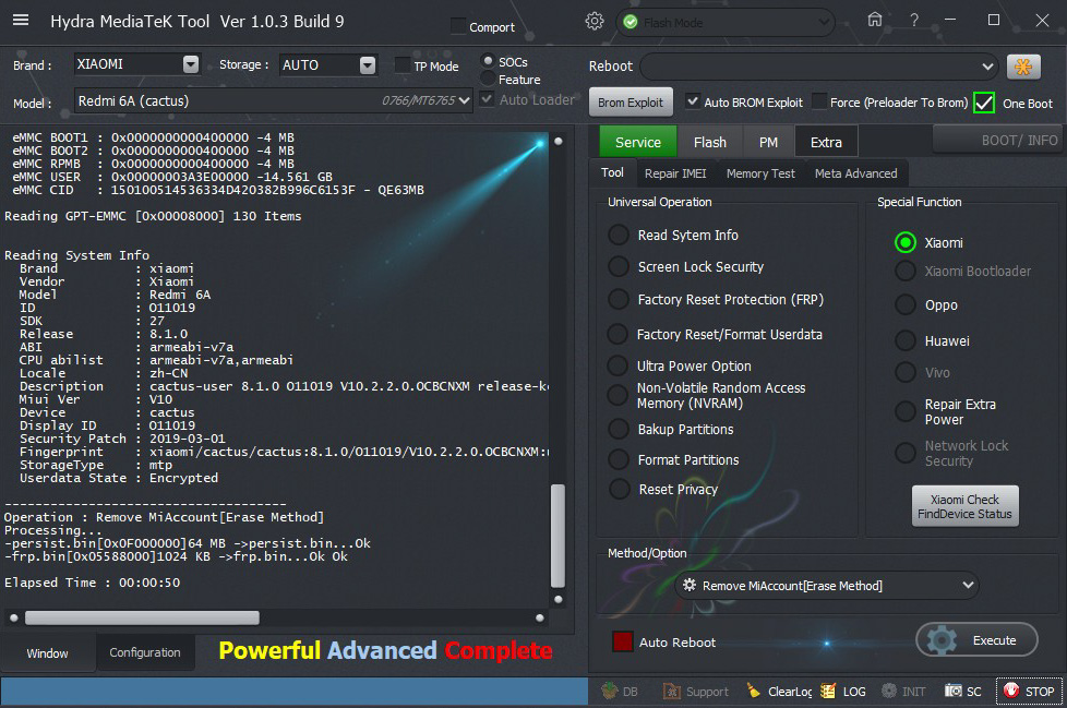 Xiaomi Redmi 6A (Cactus) Mi Account successfully Removed by Erasing Method by Hydra Tool