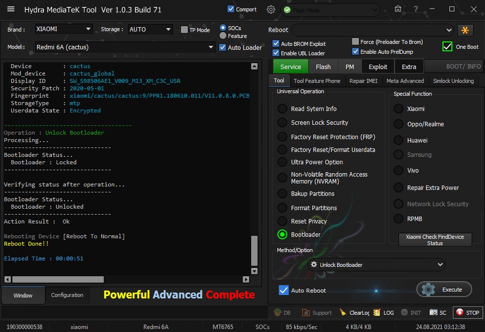 Xiaomi Redmi 6A (Cactus) unlocked bootloader successfully done by Hydra Tool