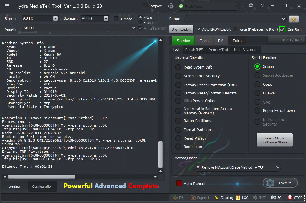 Xiaomi Redmi 6A Mi Account and FRP removed with Erased Method by Hydra Tool