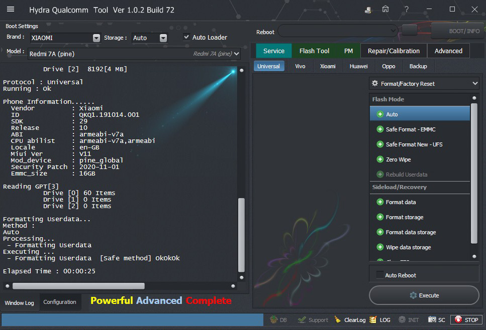 Xiaomi Redmi 7A pine formatting data successfully done by Hydra Tool