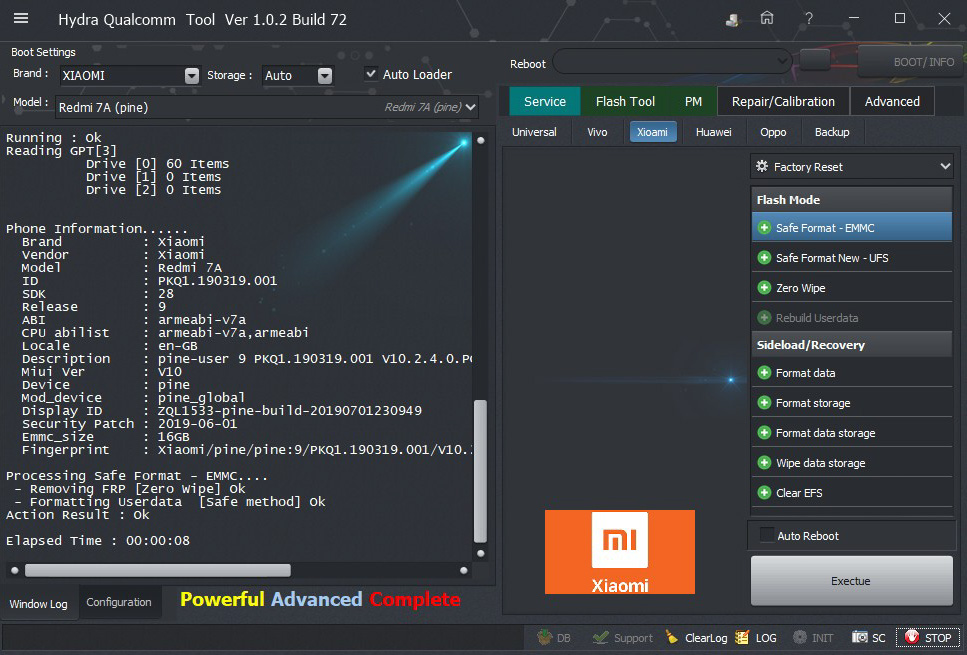Xiaomi Redmi 7A Pine Safe Format user data successfully done by Hydra Tool