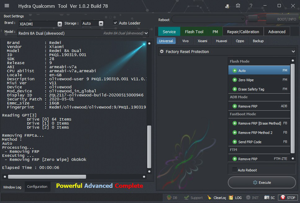 Xiaomi redmi 8A Dual Olivewood Zero Wipe FRP successfully done by Hydra Tool