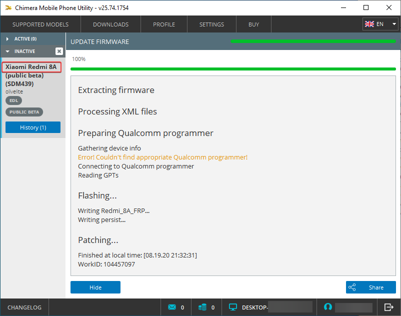 Chimera Mobile Phone Utility version: 25.74.1754 @ 2020-08-19