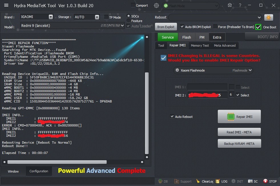 Xiaomi REdmi 9 (Lancelot) Repair IMEI successfully done by Hydra Tool