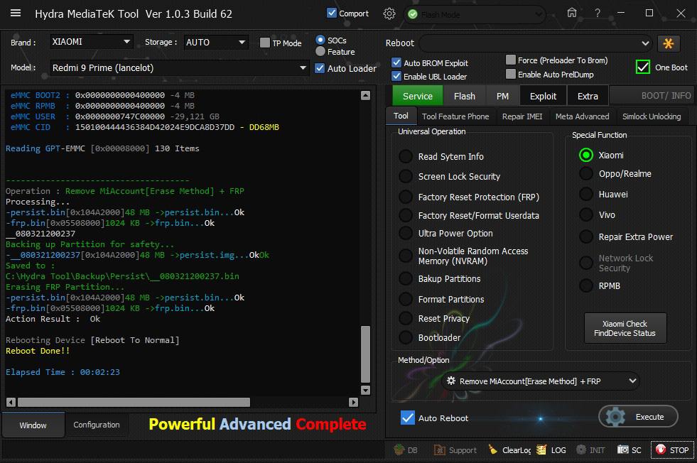 Xiaomi Redmi 9 Prime (Lancelot) Mi Account and FRP successfully Erased by Hydra Tool