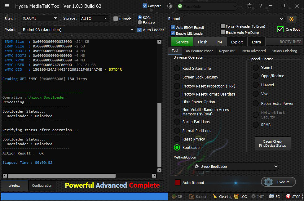 Xiaomi Redmi 9A (Dandelion) bootloader unlock successfully done by Hydra Tool