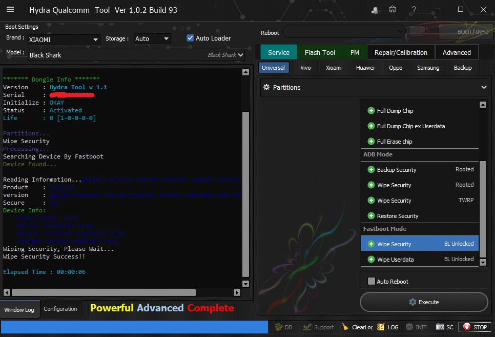 Xiaomi Black Shark wiping securities successfully done by Hydra Tool