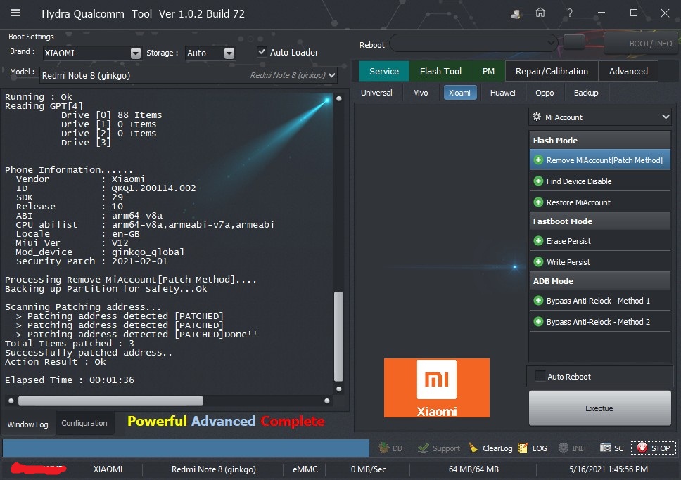 Xiaomi Redmi Note 8 (Ginkgo) Mi Account successfully patched by Hydra Tool