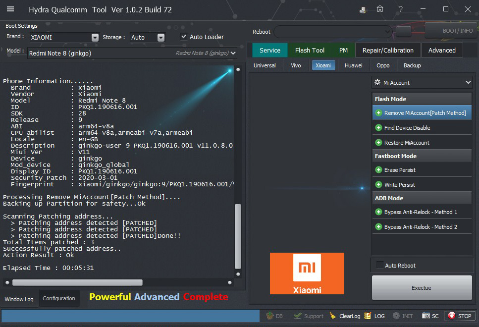 Xiaomi Redmi Note 8 (Ginkgo) removed MI Account successfully done by Hydra Tool