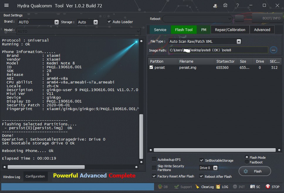 Xiaomi Redmi Note 8 Presist.img successfully flashed to repair cellphone by Hydra Tool