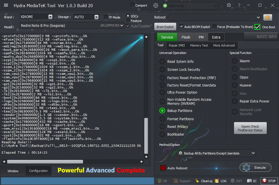 Xiaomi Redmi Note 8 Pro Begonia Backup Partition successfully done by Hydra Tool