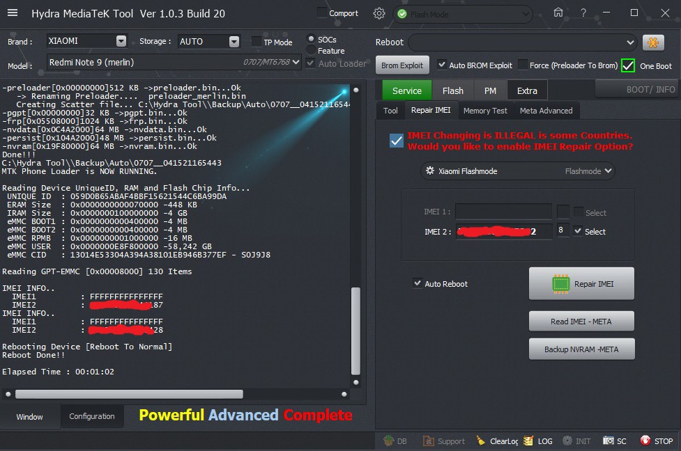 Xiaomi Redmi Note 9 Merlin IMEI repaird successfully done by Hydra Tool