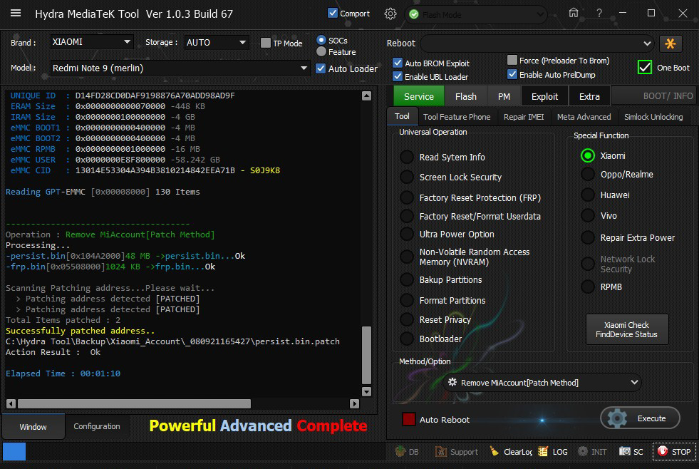 Xiaomi Redmi Note 9 (Merlin) Mi Account successfully removed by Hydra Tool