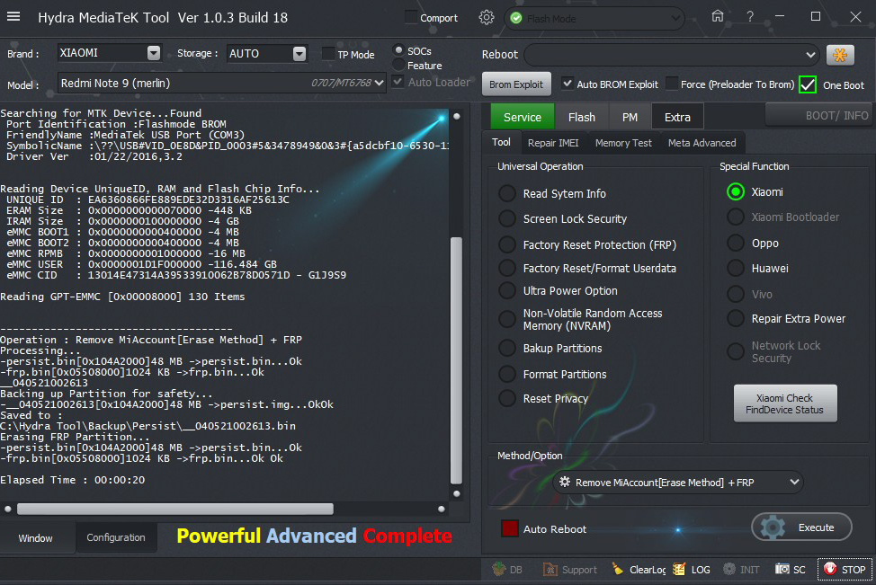 Xiaomi Redmi Note 9 Merlin Removing Mi Account and FRP successfully done by Hydra Tool