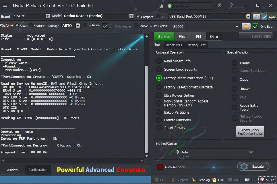 Xiaomi Redmi Note 9 (merlin) Zero wipe FRP successfully done by Hydra Tool