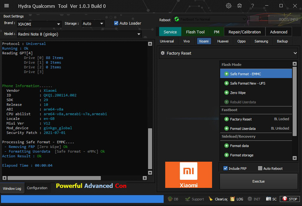 Hydra Xiaomi Redmi Notte8 8 (Ginkgo) zero wipe FRP successfully done by Hydra Tool