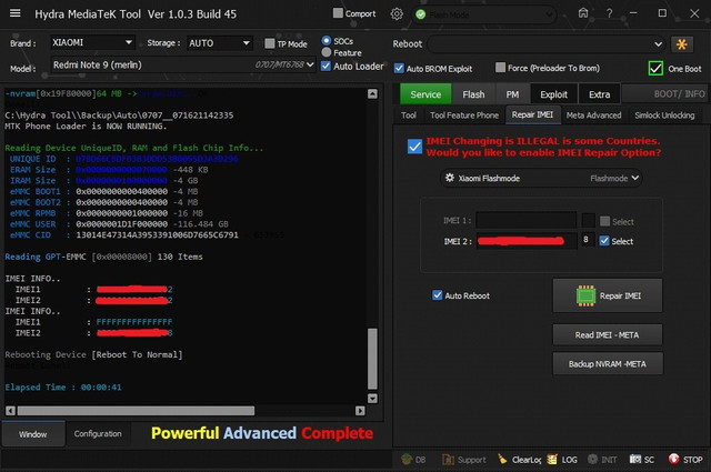 Xiaomi Remi Note 9 (merlin) Repair second IMEI successfully done by Hydra