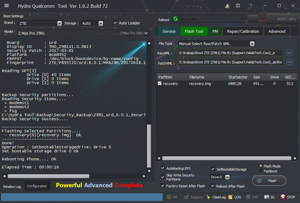 ZTE Z Max Pro Z981 Recovery Image successfully flashed by Hydra Tool
